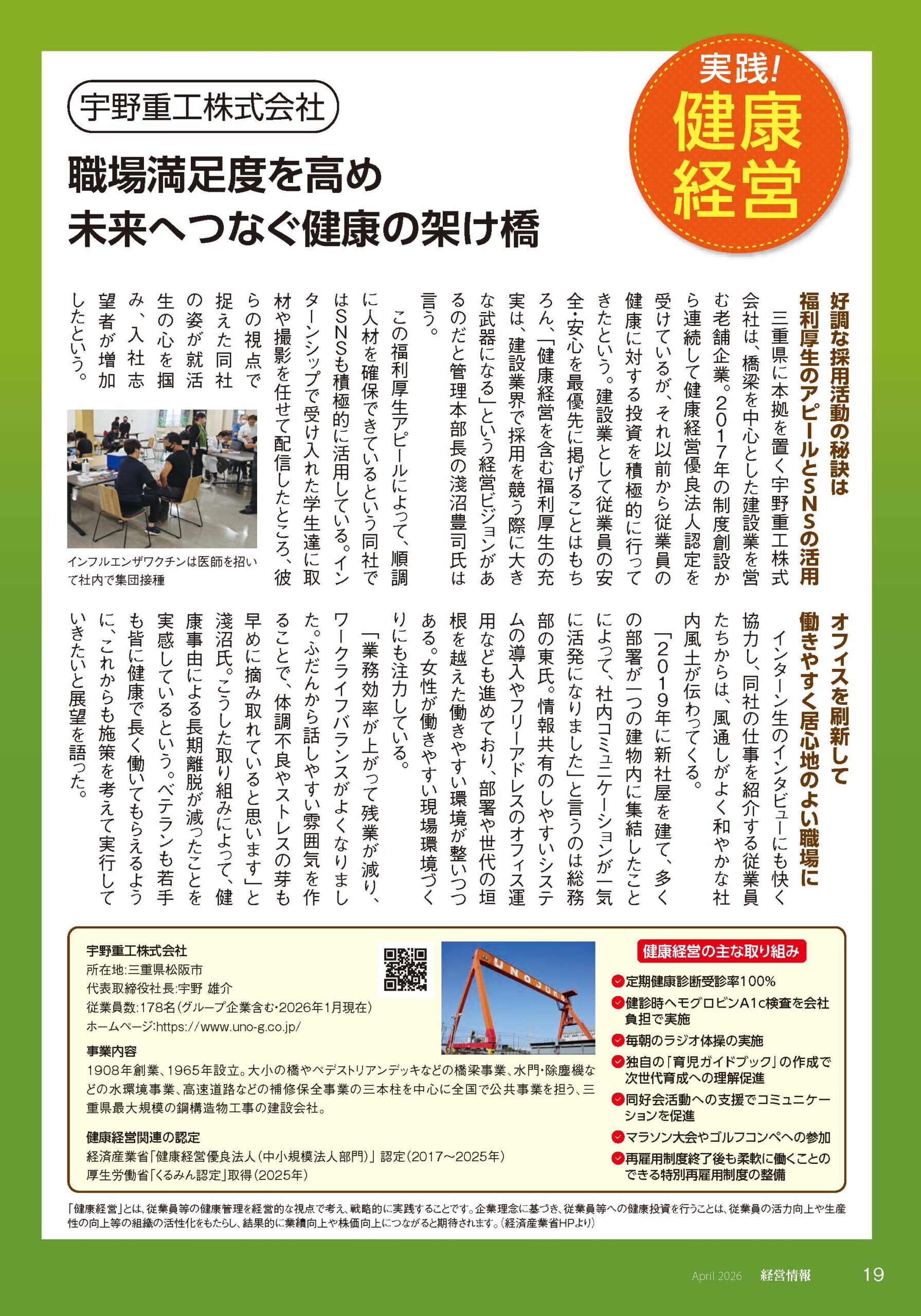 今回の特集では、 宇野重工の健康経営の取り組みについてご紹介いただきました。